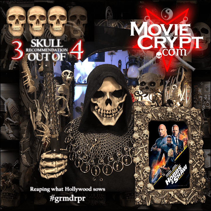Fast and Furious Presents: Hobbs and Shaw is rated PG-13 for prolonged sequences of action and violence, suggestive material, some strong language, and three (count ’em) mid and after-credit sequences.