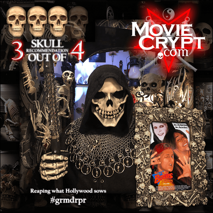 A few years after a most excellent adventure passing history, Ted Theodore Logan (Keanu Reeves) and Bill S. Preston Esquire (Alex Winter) are no further along in realizing their dream of stardom than they are of learning to play their instruments. With the love and approval of their princesses on the line, bad dude De Nomolos (Joss Ackland) commandeers a time machine from Rufus (George Carlin) in the future to send evil Bill and Ted robots into the past to kill the boys. Spoiler: being dead totally sucks… and the Grim Reaper (William Sadler) really hates losing.