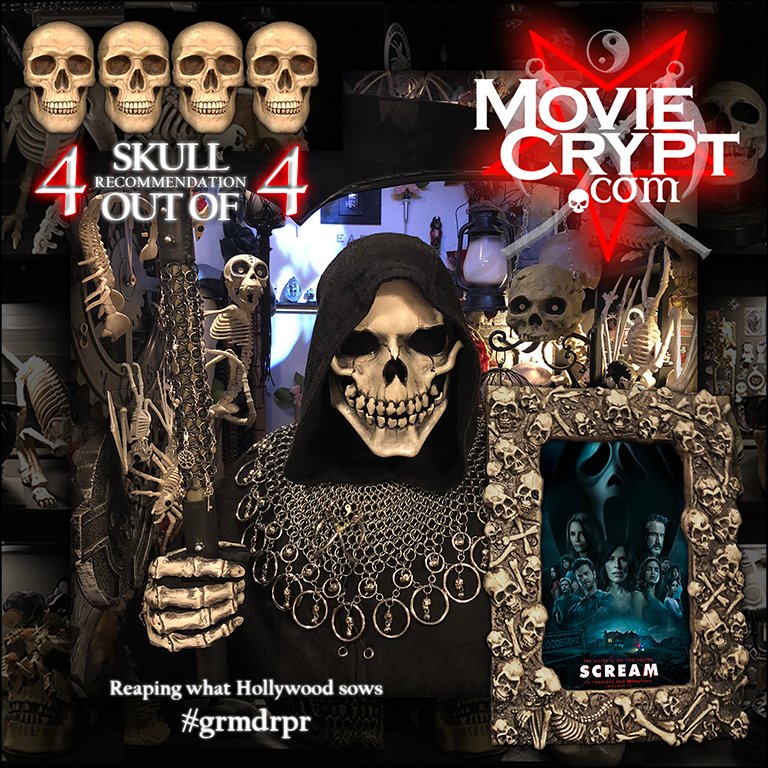 Twenty-five years after the original Woodsboro murders, a new Ghostface killer (voice of Roger L. Jackson) attacks a teen in her home (Jenna Ortega), prompting the media to again descend upon the sleepy town of Woodsboro, California looking for a story. An estranged sister (Melissa Barrera), her worried boyfriend (Jack Quaid), laid-back twins (Jasmin Savoy Brown and Mason Gooding), a mama’s boy (Dylan Minnette), a gothy girl (Mikey Madison), and an artsy friend (Sonia Ammar) add to the new circle of suspects — because it’s always someone you know. But whatever happened to the survivors of the original murders: Sidney (Neve Campbell), Dewey (David Arquette), and Gale (Courteney Cox)?