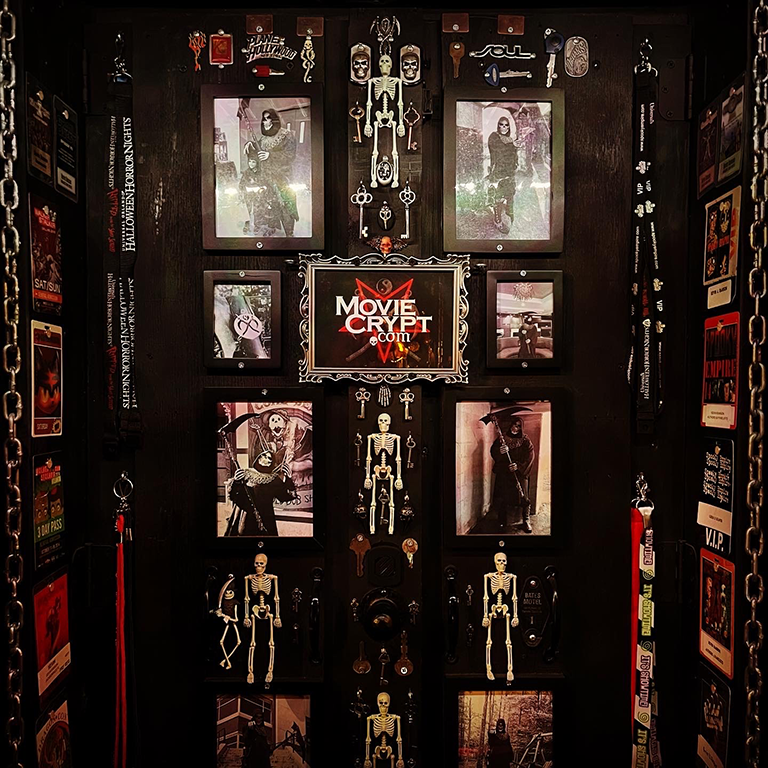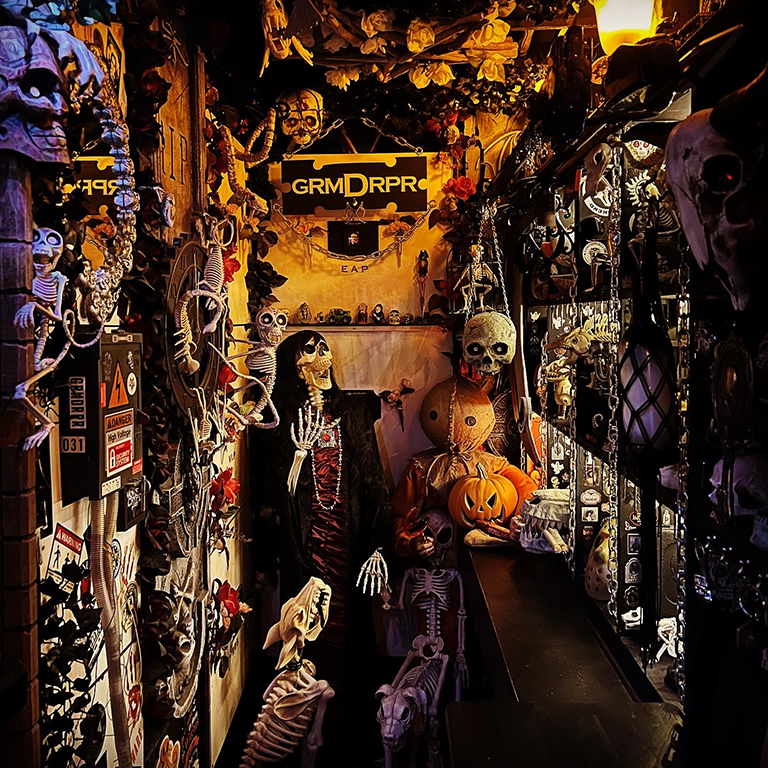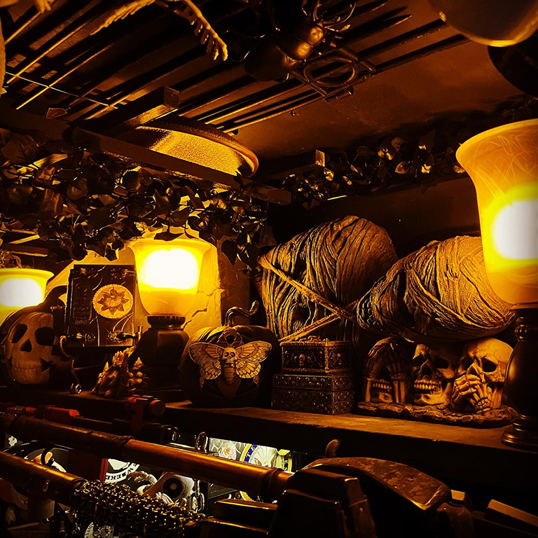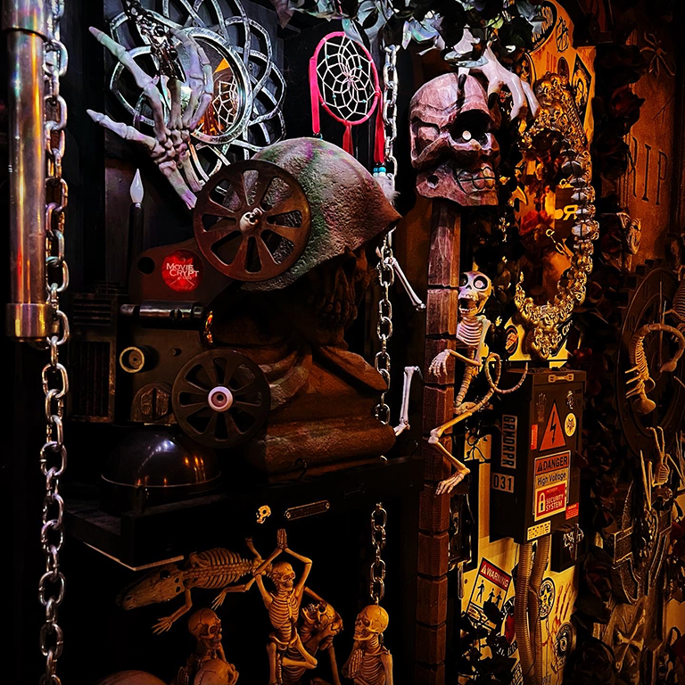 Below is The Bone Room, the oldest part of the crypt. Similar to museums that showcase skeletons and other structures, ours is an eclectic collection of various things that may or may exist. In the back are six vaults containing at least some of the remains (don’t ask) of Rod Serling, Vincent Price, Marie Laveau, Mary Shelley, H.P. Lovecraft, and Edgar Allan Poe. Standing next to the black-haired Mary Sue (and her hellhounds Butch and Sundance) is lollipop-wielding Sam, the Spirit of Halloween, hanging around when he’s not out and about.