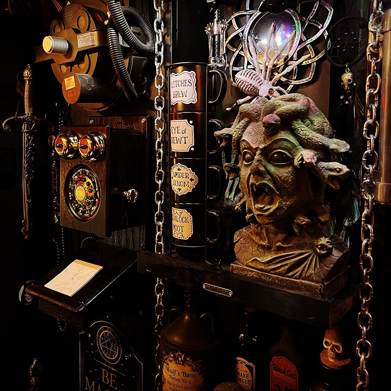 To the left of the gallery is The Apothecary, because a well-stocked crypt is a happy crypt. Medusa herself oversees the stores to ensure we don’t run out of anything, in easy reach of our black phone, Mim, if any reorders are needed. The positron collider was a gift, not a trophy as many assume… at least that’s the story we’re sticking with. To the far left is the dagger Harry Osbourne tried to kill Peter Parker with.